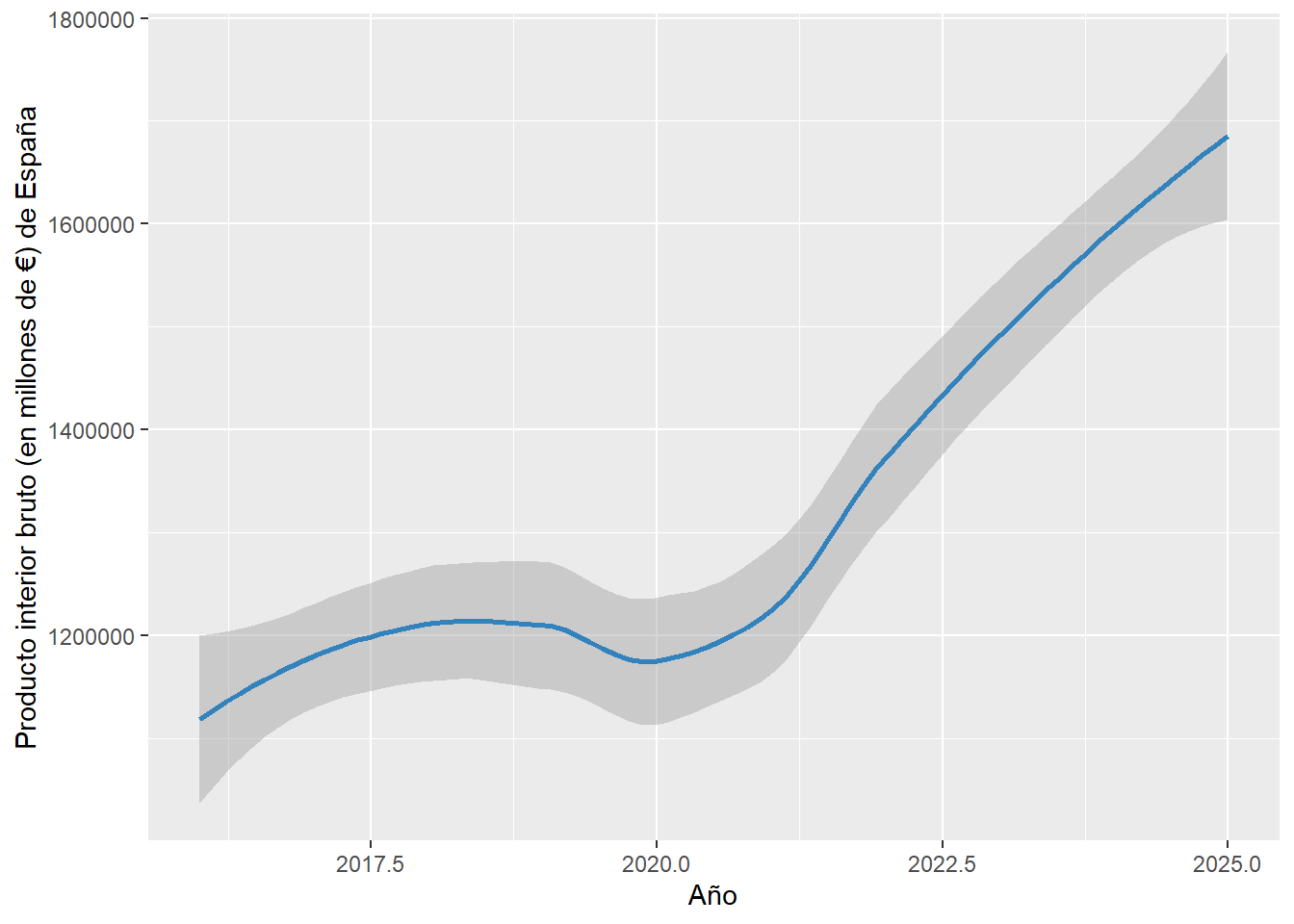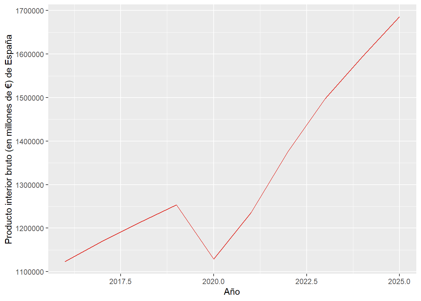 labs(y = "Producto interior bruto (en millones de €) de España", x = "Año")